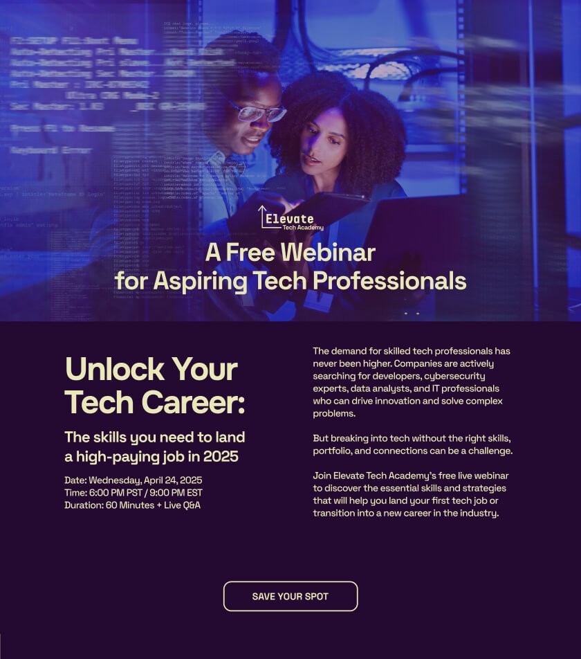 Get inspired with customizable Elevate webinar page Free Website Templates.