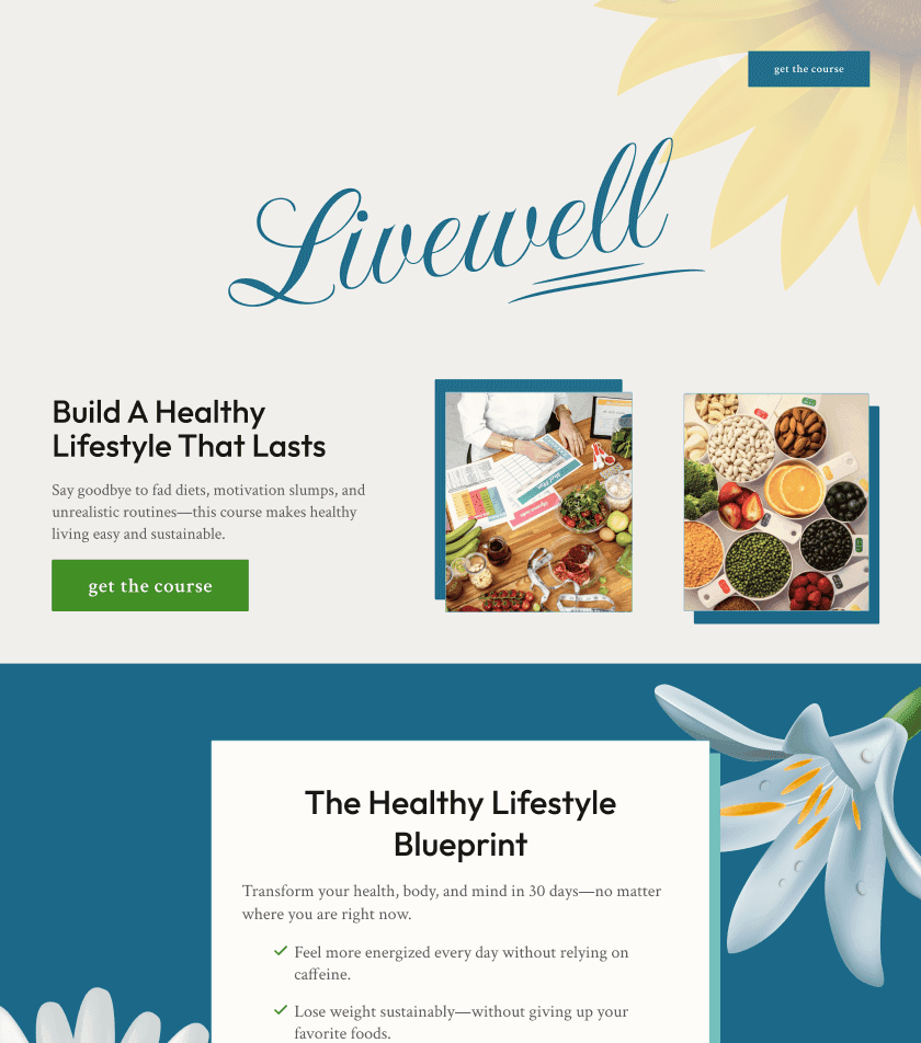Showcase your business with elegant Livewell lifestyle course page Free Website Templates.
